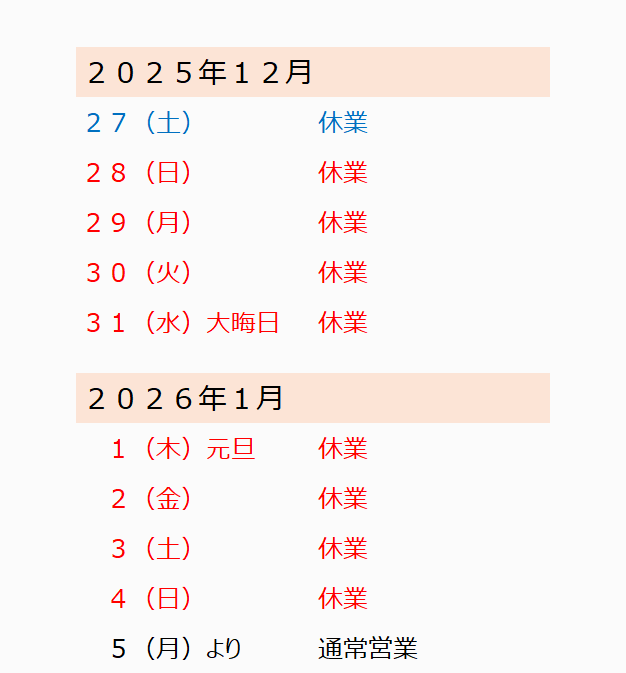 なお、年明け2025年1月5日(月)より通常どおり営業いたします。